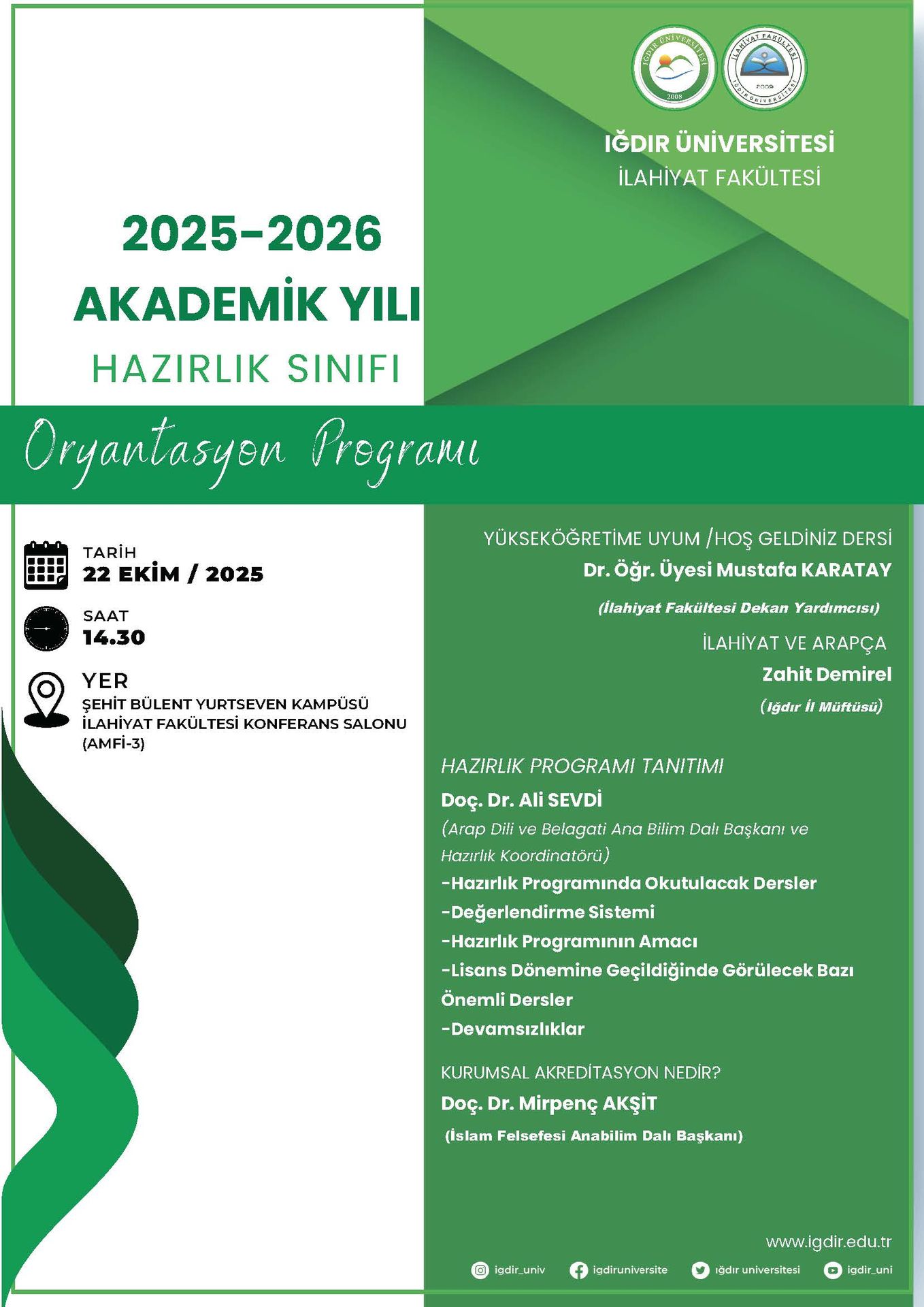 2025-2026 Akademik Yılı Hazırlık Sınıfı Oryantasyon Programı 22 Ekim 2025 tarihinde saat 14:30'da İlahiyat Fakültesi Konferans Salonunda Gerçekleşecektir.