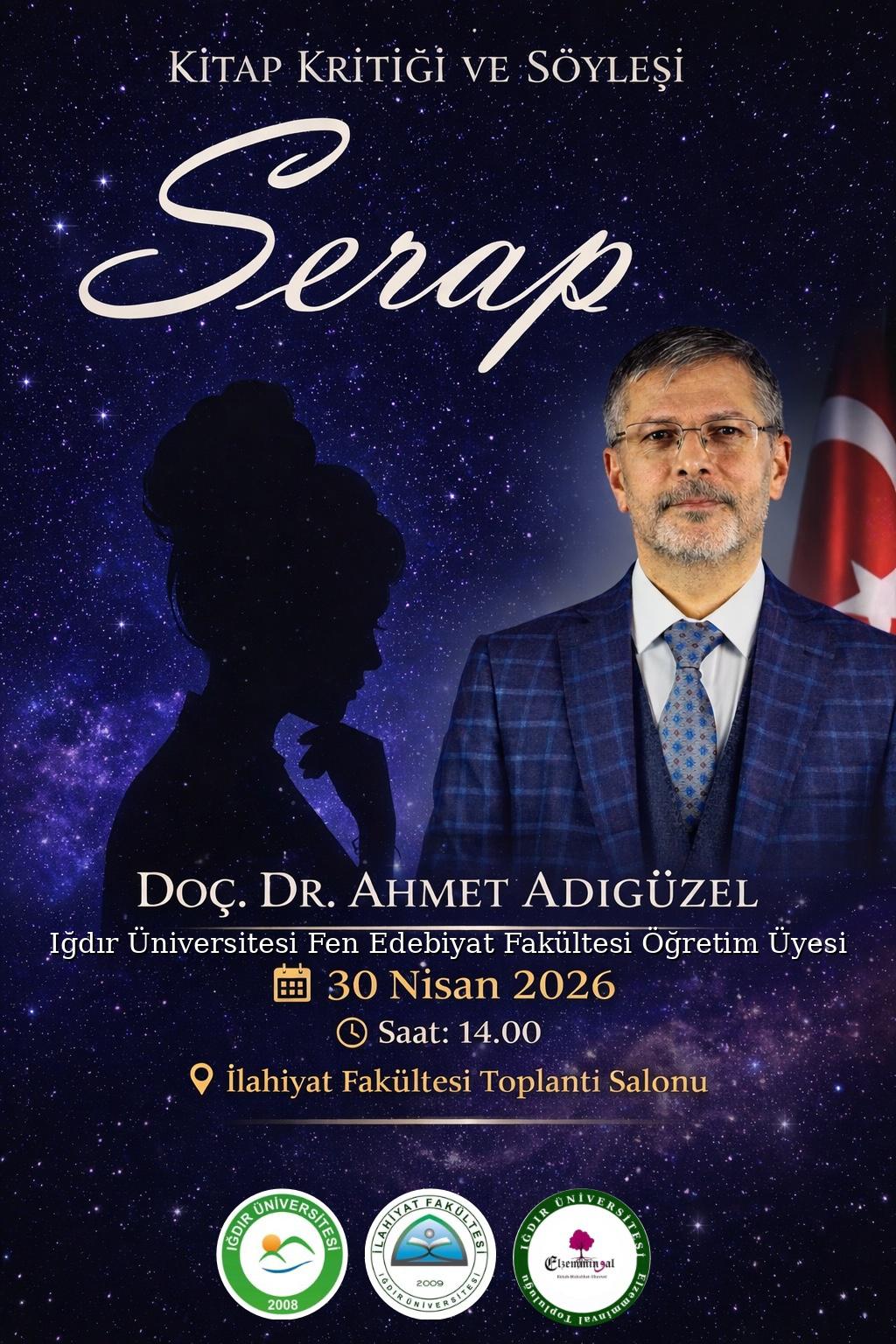 Iğdır Üniversitesi Fen Edebiyat Fakültesi Öğretim Üyesi Doç. Dr. Ahmet Adıgüzel'in "SERAP" adlı hikaye kitabı bu hafta İlahiyat Fakültesi "ELZEM MİNVAL KİTAP KULÜBÜ üyeleri tarafından yazar Doç. Dr. Ahmet Adıgüzel'in katılımıyla kritik edilecek. "Elzem Minval Kitap Kulübü" akademik danışmanı Prof. Dr. Zeki TAN "Kulüp üyeleriyle birlikte şimdiye kadar kritiğini yaptığımız dördüncü kitap. Kitap okuma ve daha sonra kritik etmeyi önemsiyoruz. Çünkü kitap okumak hem beynin çalışmasını hem de anlamada halen alternatifsiz tek nesnedir. Yapay zekanın hızla yükselişine rağmen, O'nu da ihmal etmeden fakat "Doğal zekayı" da kullanmak gerekir." dedi.