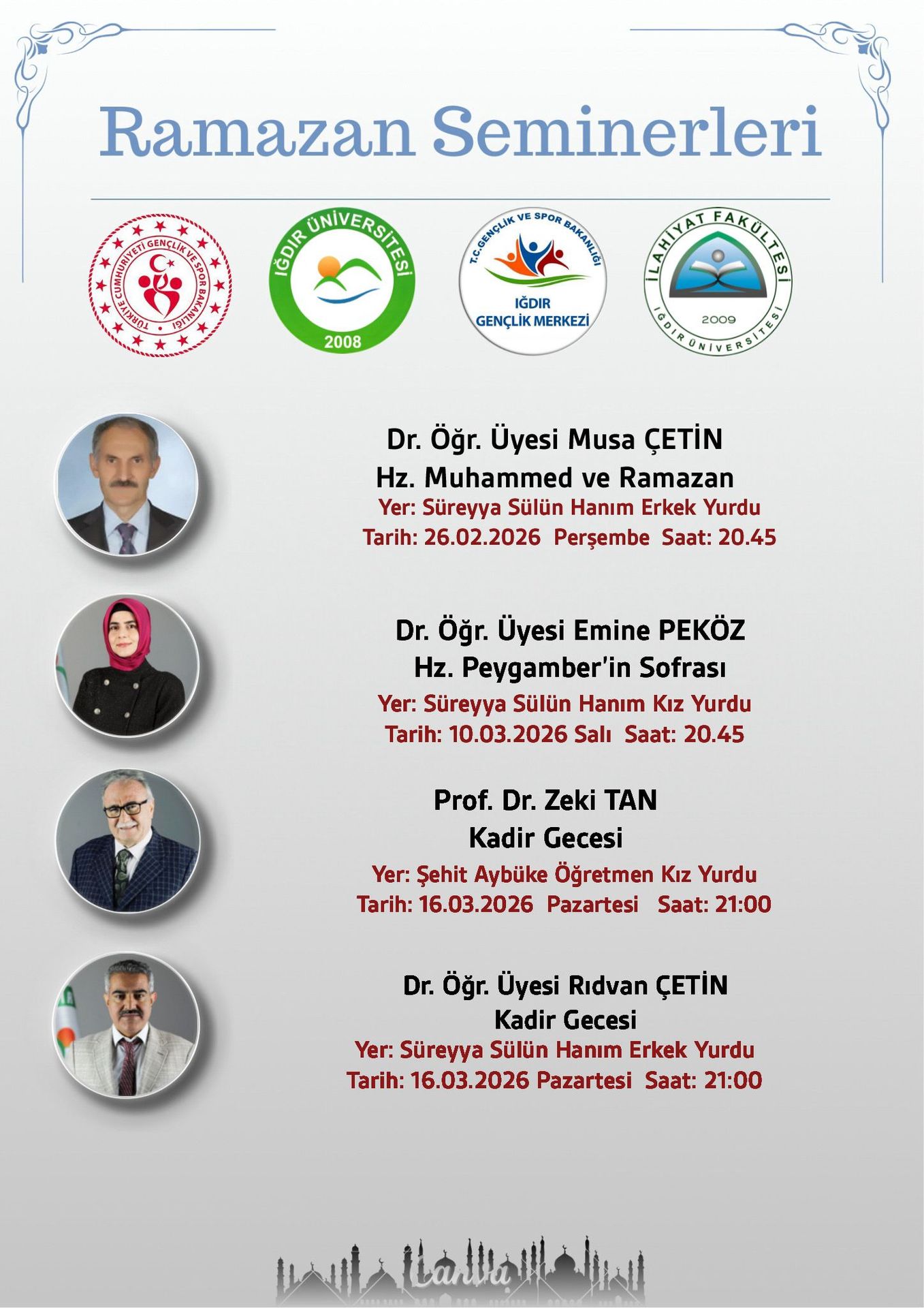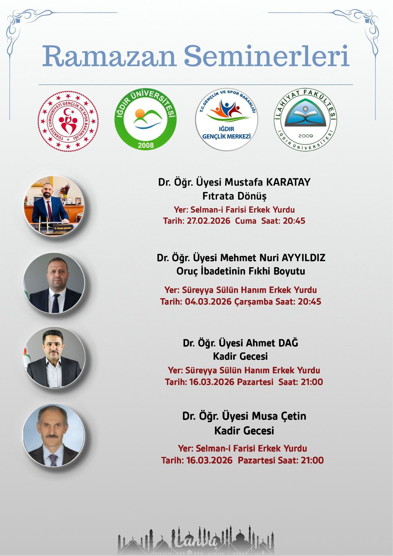 Üniversitemiz İlahiyat Fakültesi akademisyenleri tarafından Ramazan ayı içerisinde Gençlik ve Spor İl Müdürlüğüne bağlı KYK yurtlarında kalan öğrencilerimize yönelik seminerler gerçekleştirilecektir.