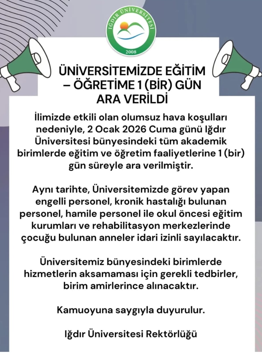 Olumsuz hava koşulları nedeniyle Üniversitemizdeki tüm akademik birimlerde 02.01.2026 tarihinde eğitim-öğretim faaliyetlerine 1 (bir) gün ara verilmiştir.