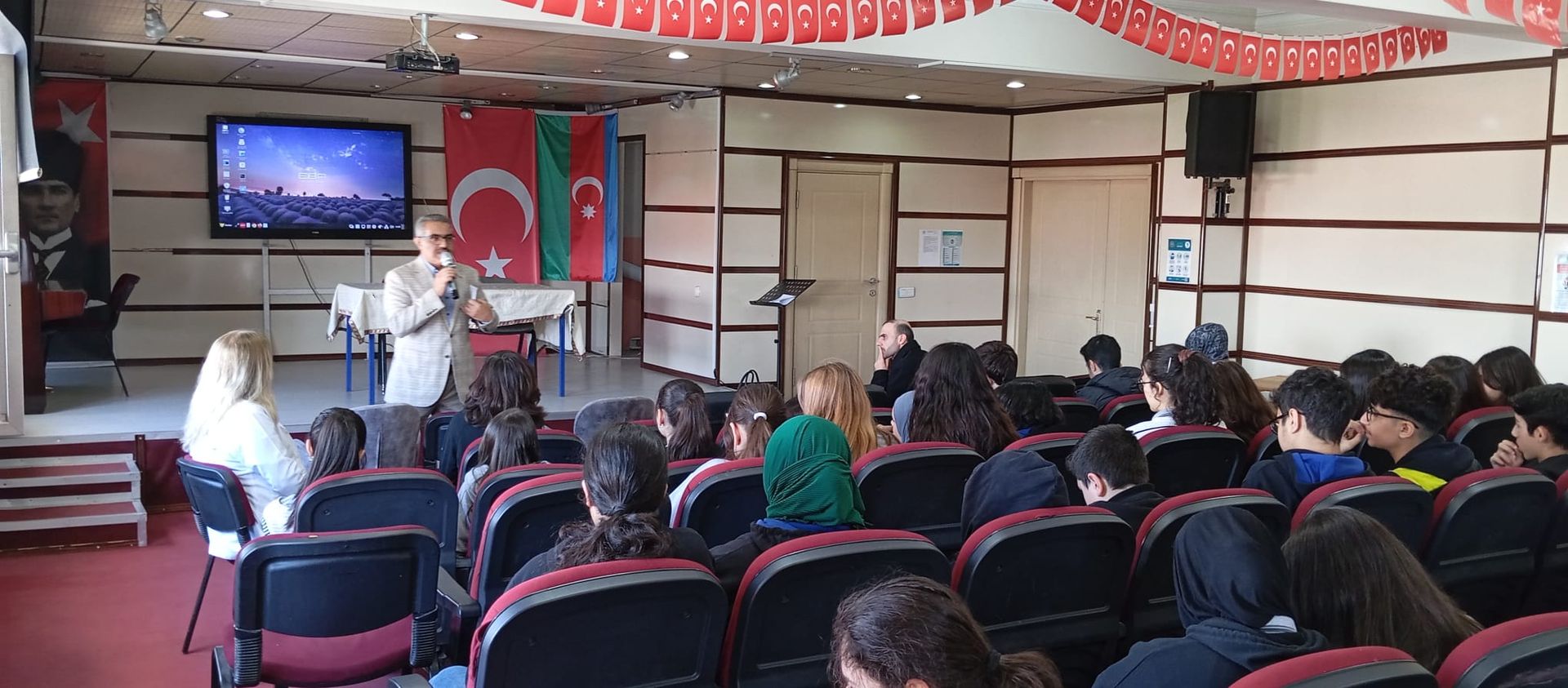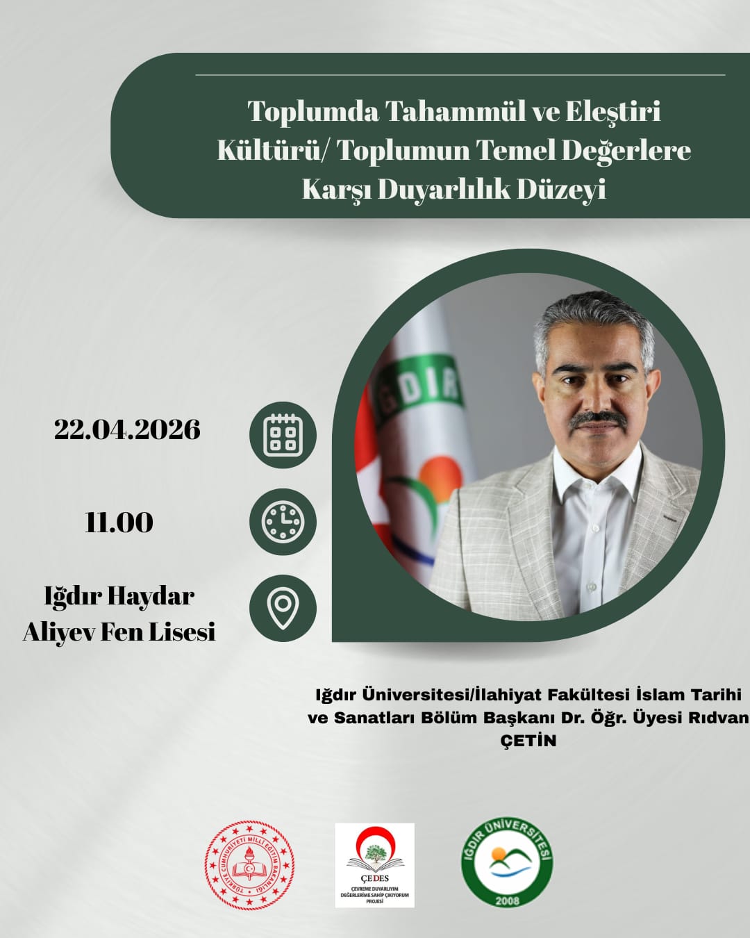 IĞDIR – Milli Eğitim Bakanlığı tarafından yürütülen "Çevreme Duyarlıyım, Değerlerime Sahip Çıkıyorum" (ÇEDES) projesi kapsamında, Iğdır Haydar Aliyev Fen Lisesi önemli bir konferansa ev sahipliği yaptı. Fakültemiz İslam Tarihi ve Sanatları Bölüm Başkanı Dr. Öğr. Üyesi Rıdvan Çetin, öğrencilere yönelik kapsamlı bir sunum gerçekleştirdi.