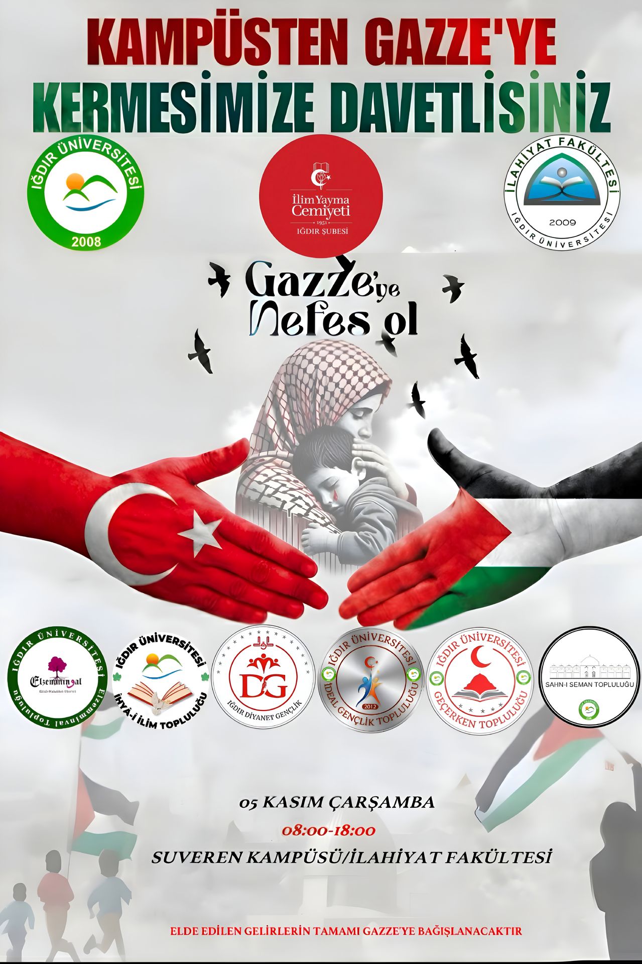 Üniversitemizde "Kampüsten Gazze'ye" kermesi düzenlenecektir. Elde edilen gelirin tamamının Gazze'ye bağışlanacağı kermese tüm personel, öğrenci ve vatandaşlarımız davetlidir.